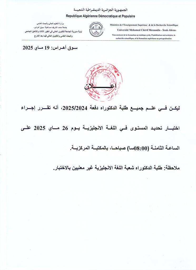 إعلان لفائدة طلبة الدكتوراه دفعة 2025/2024