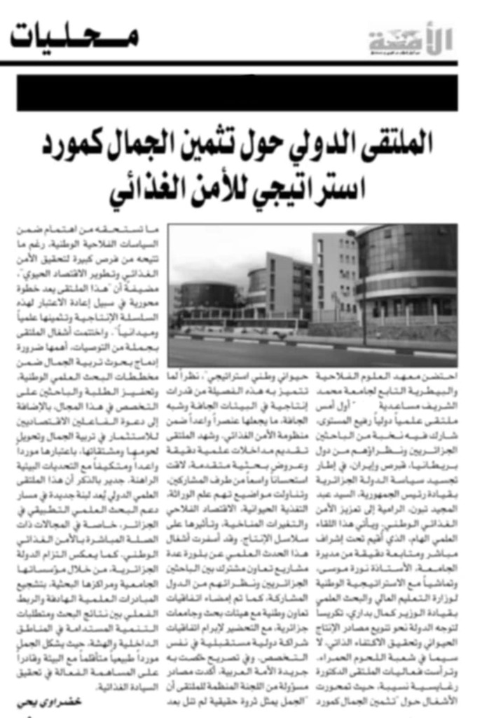 مقال صحفي حول الملتقى الدولي ” تثمين الجمال كمورد استراتيجي للأمن الغذائي”.