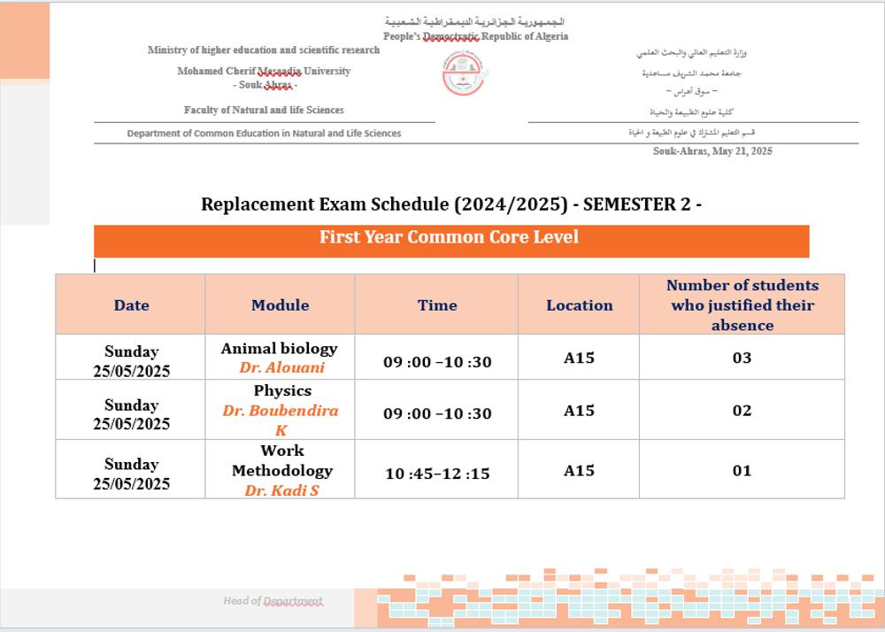 ليكن في علم طلبة السنة أولى ليسانس المعنيين بالإمتحانات التعويضية (الذين قدمو مبررا مقبولا وفق التنظيمات المعمول بها) أنها ستجرى يوم الأحد 25 ماي 2025 بالمدرج رقم 15 و ذلك حسب الرزنامة التالية