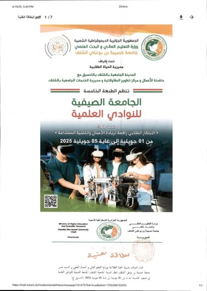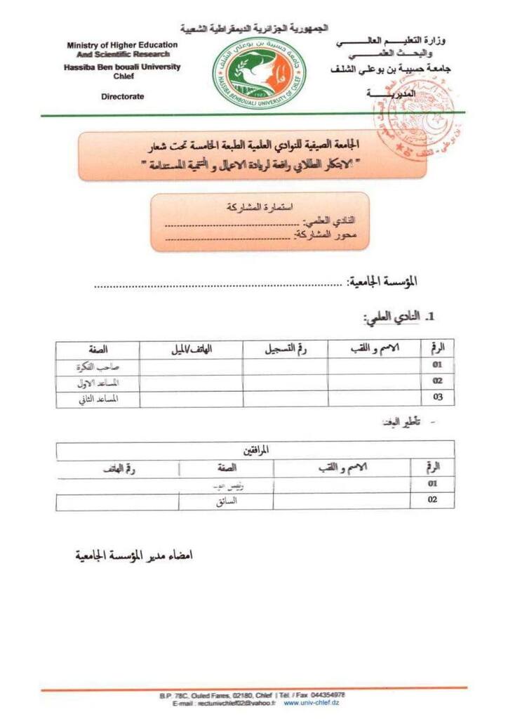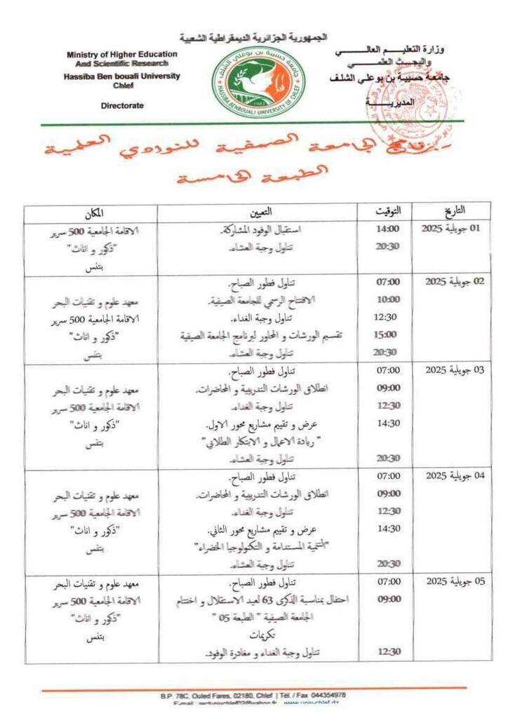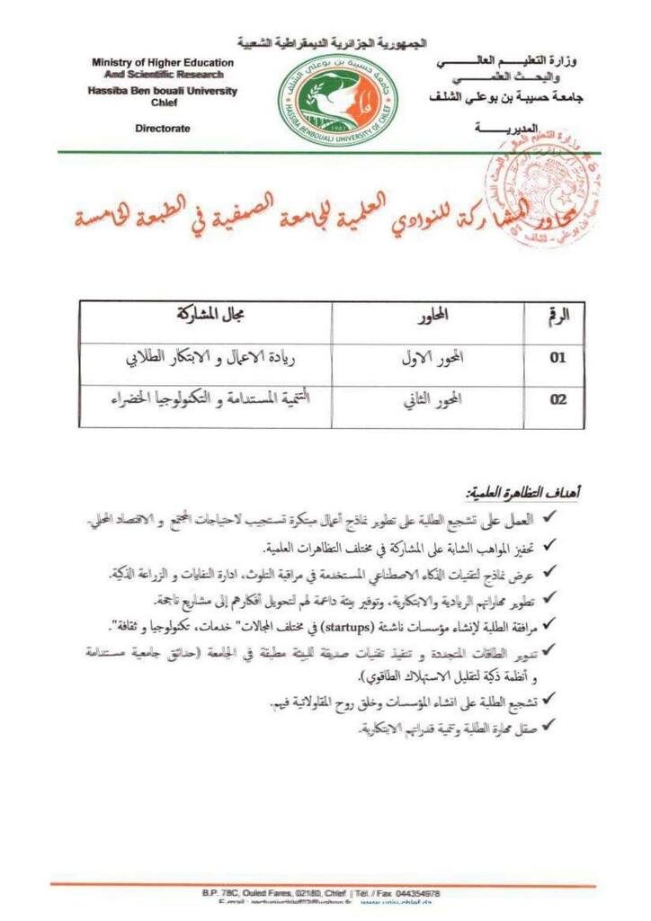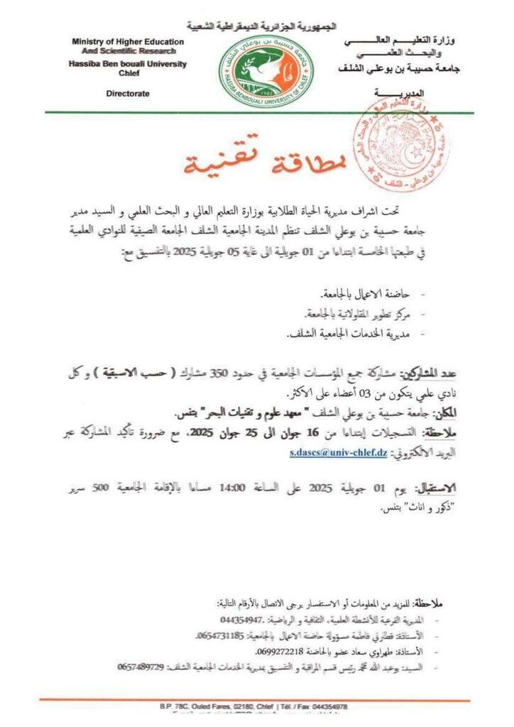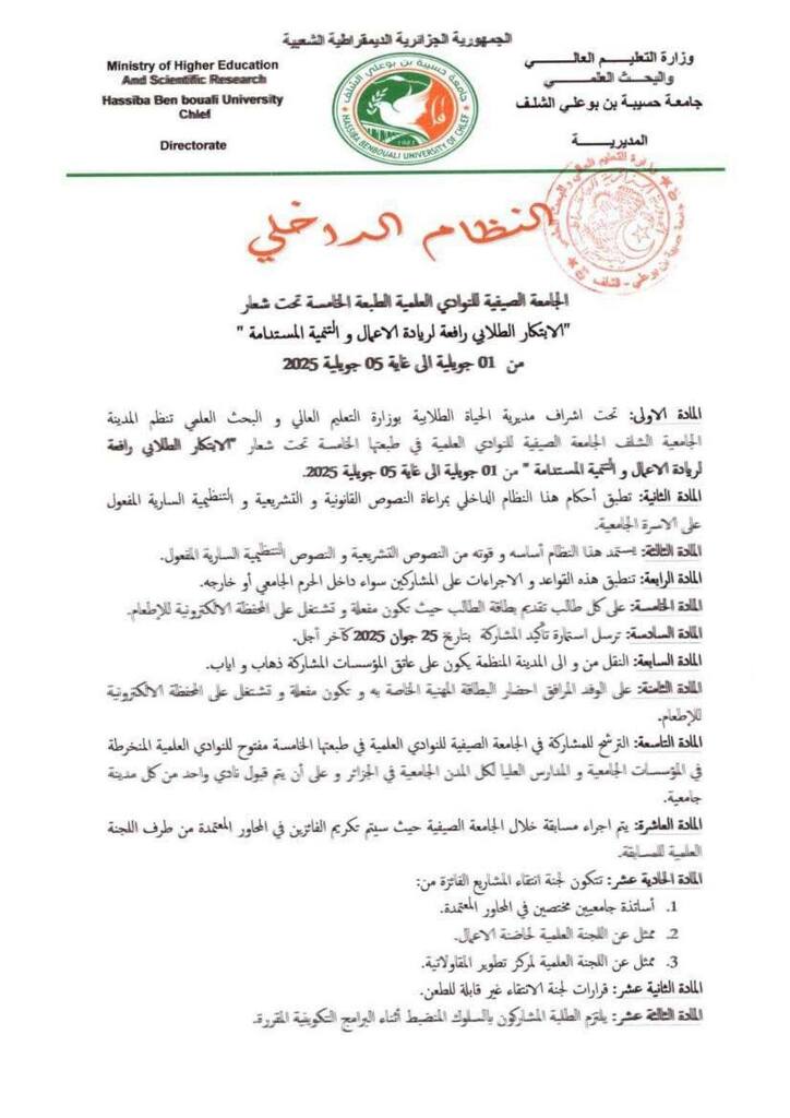 “الابتكار الطلابي رافعة لريادة الأعمال و التنمية المستدامة ” و التي ستنظمها جامعة حسيبة بن بوعلي الشلف بمعهد علوم و تقنيات البحر بتنس بالتنسيق مع حاضنة الأعمال و مركز تطوير المقاولاتية و مديرية الخدمات الجامعية الشلف ، في الفترة الممتدة من 01 جويلية إلى 05 جويلية 2025
