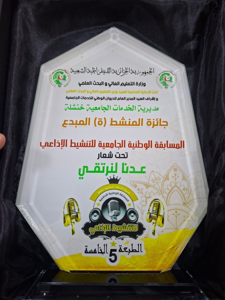 و تحقيقه المرتبة الخامسة وطنيا في المسابقة الوطنية الجامعية لتنشيط الاذاعي المنظمة من طرف مديرية الخدمات الجامعية خنشلة