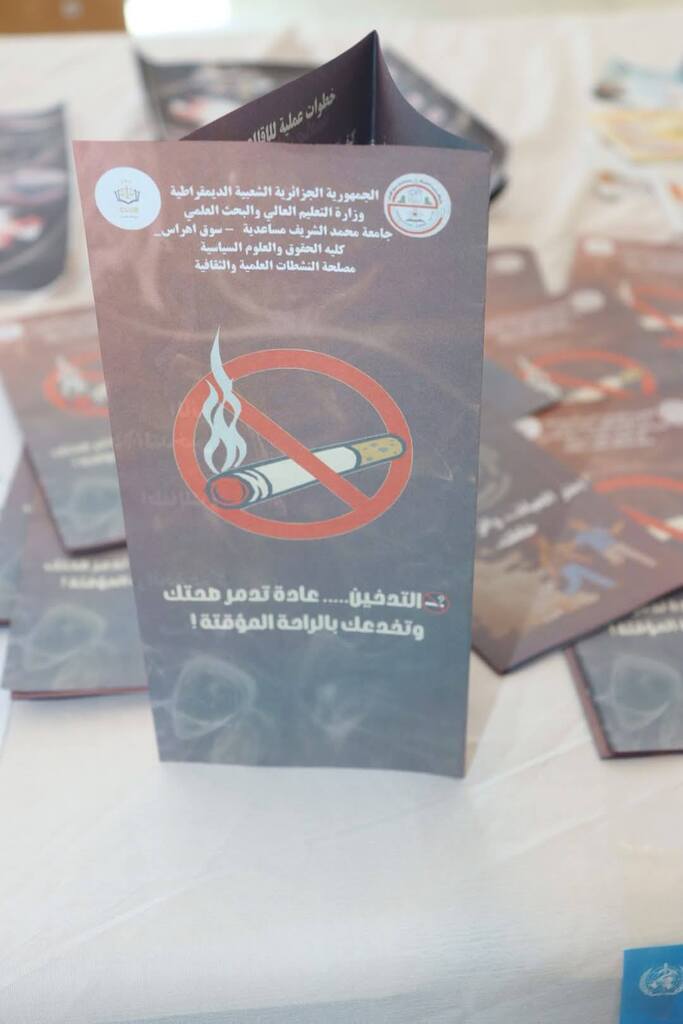 تزامنا مع اليوم العالمي لمكافحة التدخين المصادف للواحدو الثلاثين من شهر ماي من كل سنة نظمت المديرية الفرعية للانشطة العلمية الثقافية والرياضيةيوم 04 ماي 2025 يوم تحسيسيا و توعويا لفائدة الطلبة