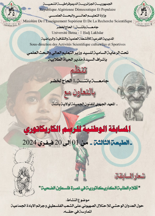 من تنظيم جامعة الحاج لخضر باتنة 1 بالتنسيق مع المعهد الجهوي للفنون الجميلة لولاية باتنة المسابقة الوطنية الجامعية للرسم الكاريكاتوري – الطبعة الثالثة.