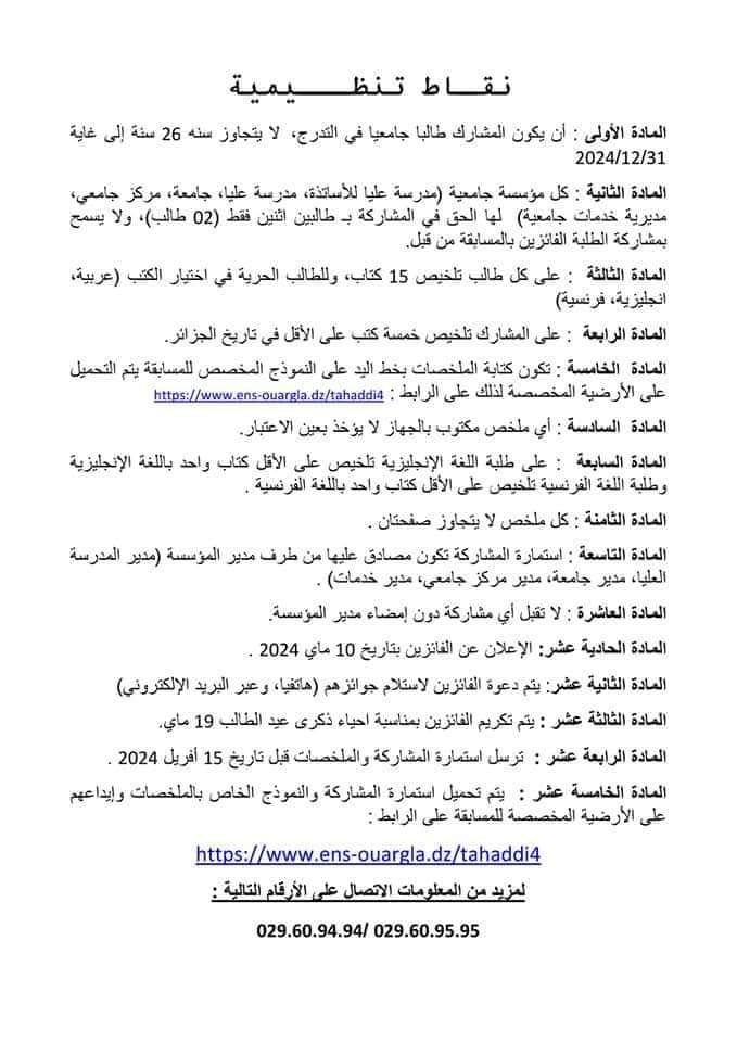 An invitation to participate in the fourth edition of the National University Competition in the “Reading Challenge” remotely, organized by the Higher School of Normal in Ouargla during the period from March 15 to April 15, 2024. Students wishing to participate should contact the Sub-Directorate for Scientific, Cultural and Sports Activities located next to the College of Law. Deadline for registration: Sunday, April 7, 2024 good luck for everbody