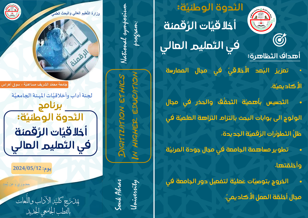 تحتضن لجنة أخلاقيات وأداب الجامعة لجامعة سوق أهراس وبرعاية السيدة المديرة – الروفيسور: نورة موسى – فعاليات الندوة الوطنية بعنوان :أخلاقيات الرقمنة في التعليم العالي.