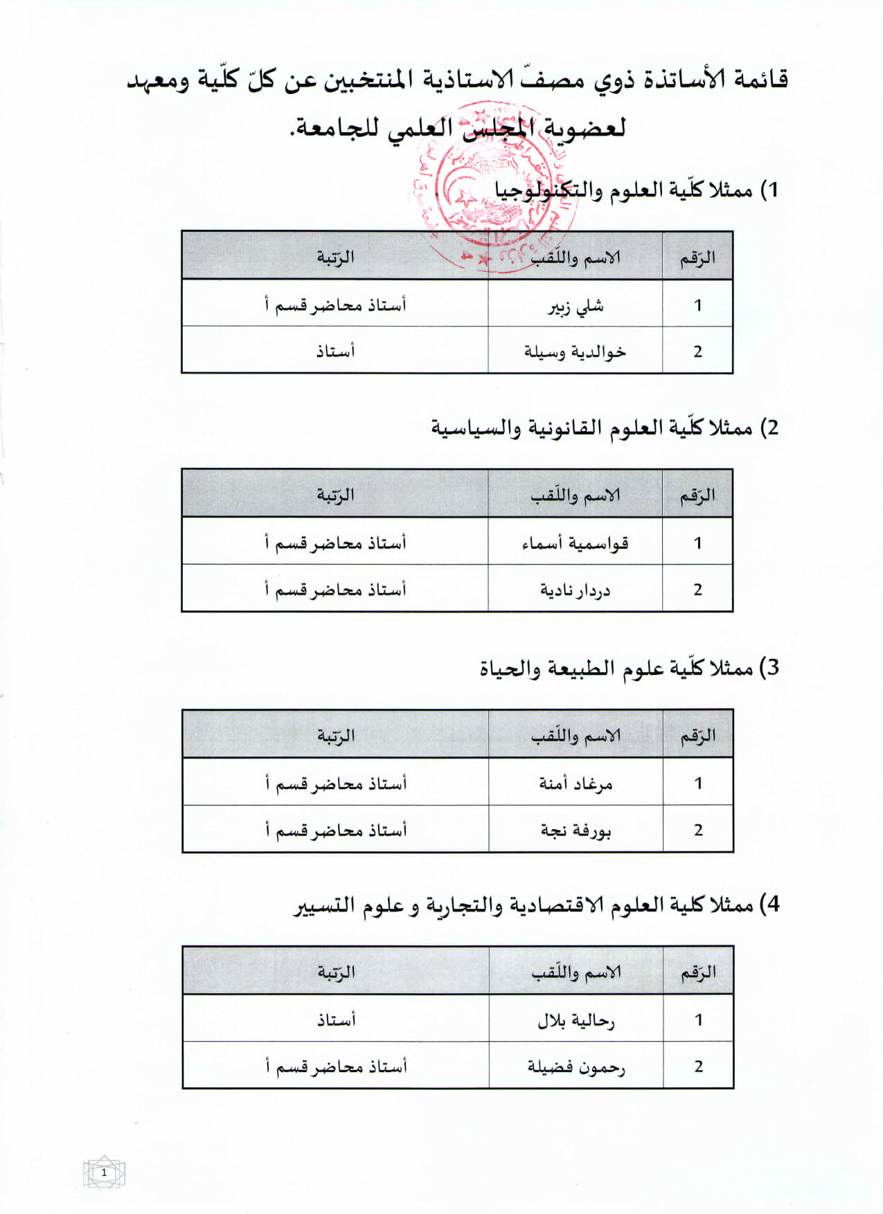قائمة الأساتذة ذوي مصفّ الاستاذية المنتخبين عن كلّ كلّية ومعهد في إطار تجديد المجلس العلمي للجامعة.