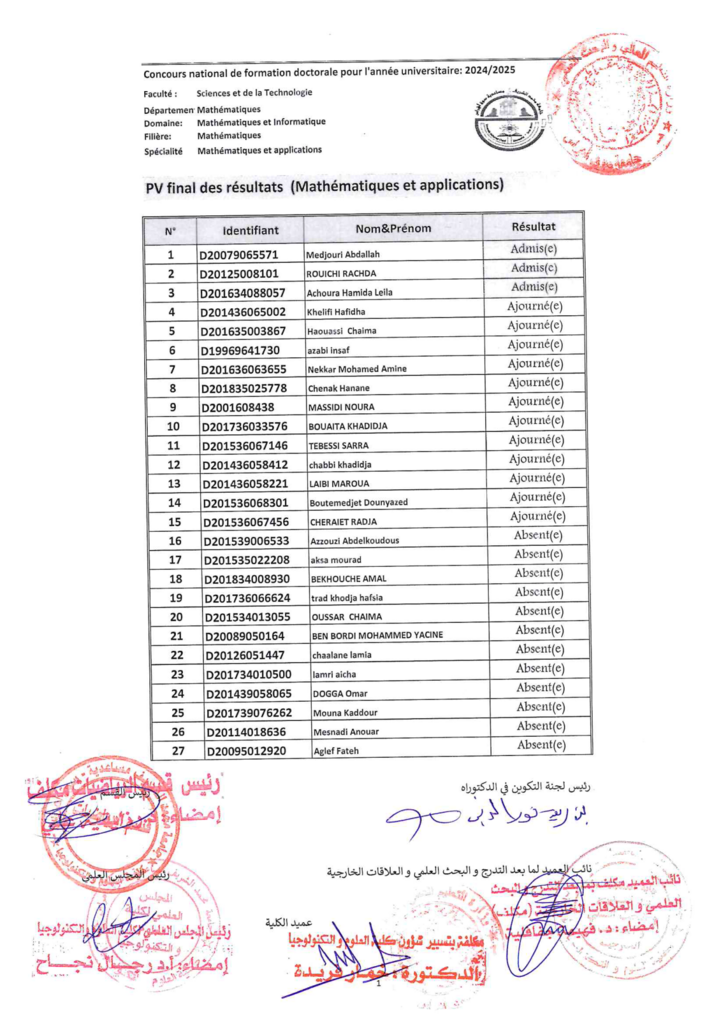 نتائج مسابقة الدكتوراه الطور الثالث للسنة الجامعية 2025/2024 شعبة رياضيات، تخصص ” Mathématiques et Applications”