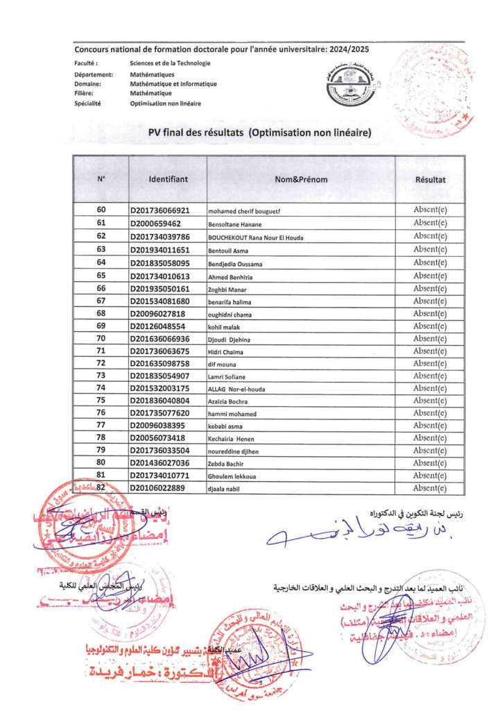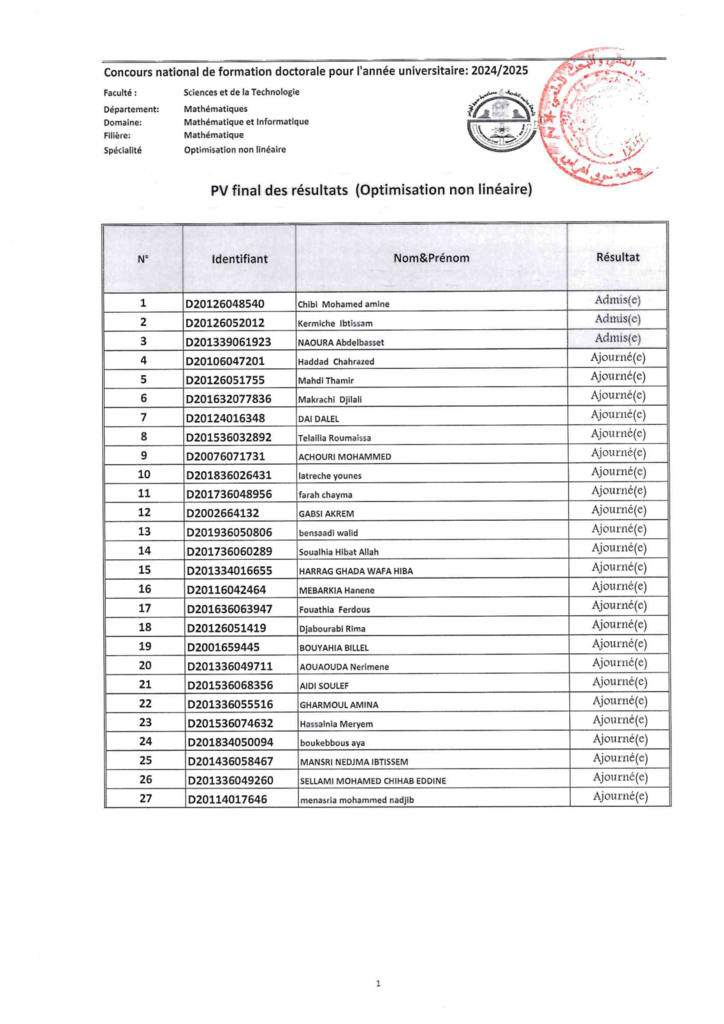 نتائج مسابقة الدكتوراه الطور الثالث للسنة الجامعية 2025/2024 شعبة رياضيات، تخصص ” Optimisation non linéaire”