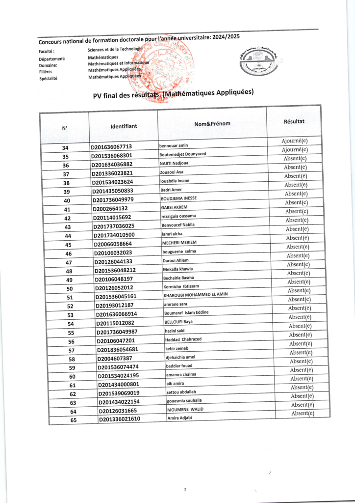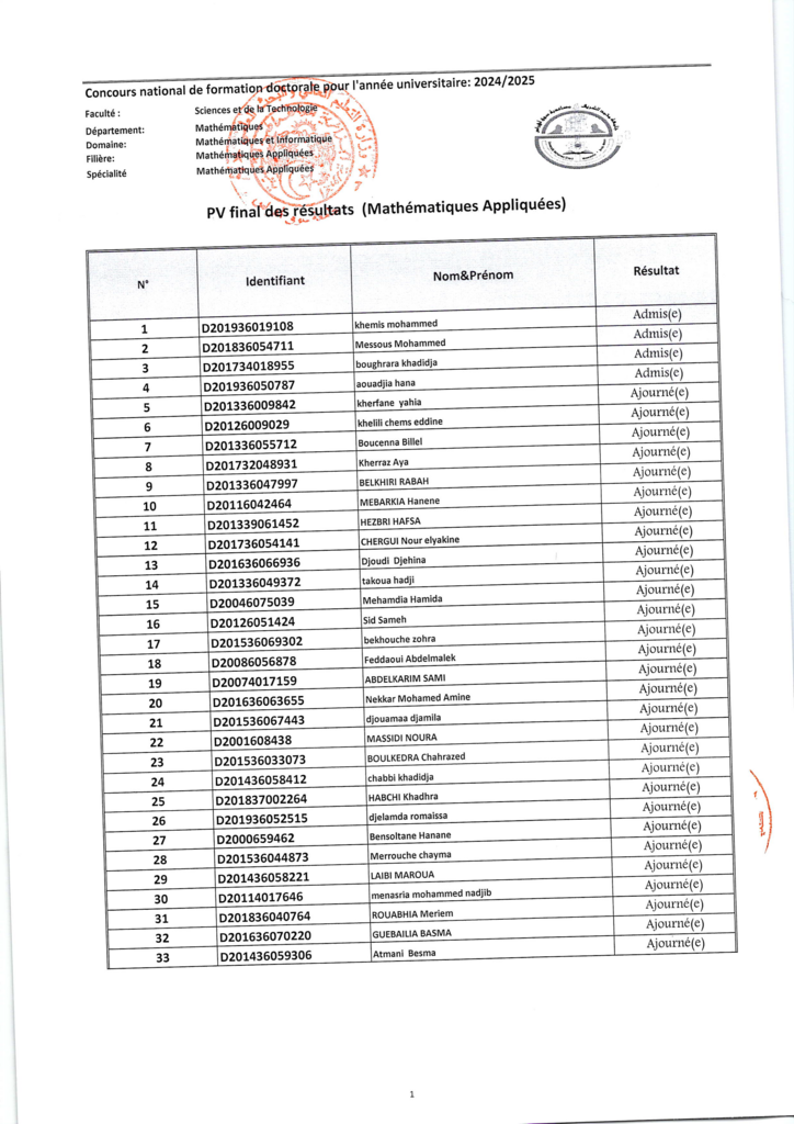 نتائج مسابقة الدكتوراه الطور الثالث للسنة الجامعية 2025/2024 شعبة رياضيات تطبيقية، تخصص رياضيات تطبيقية