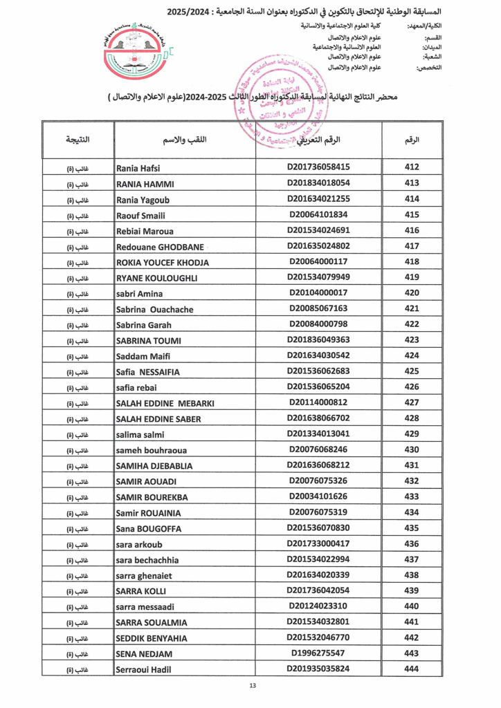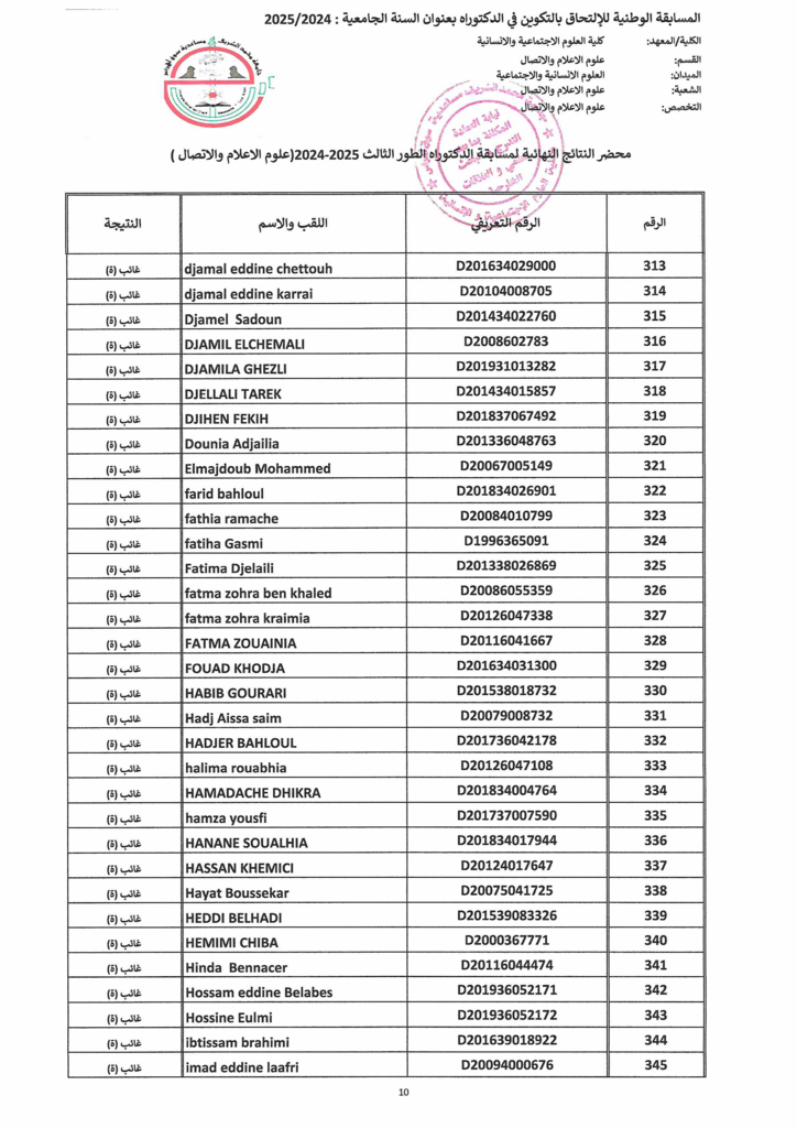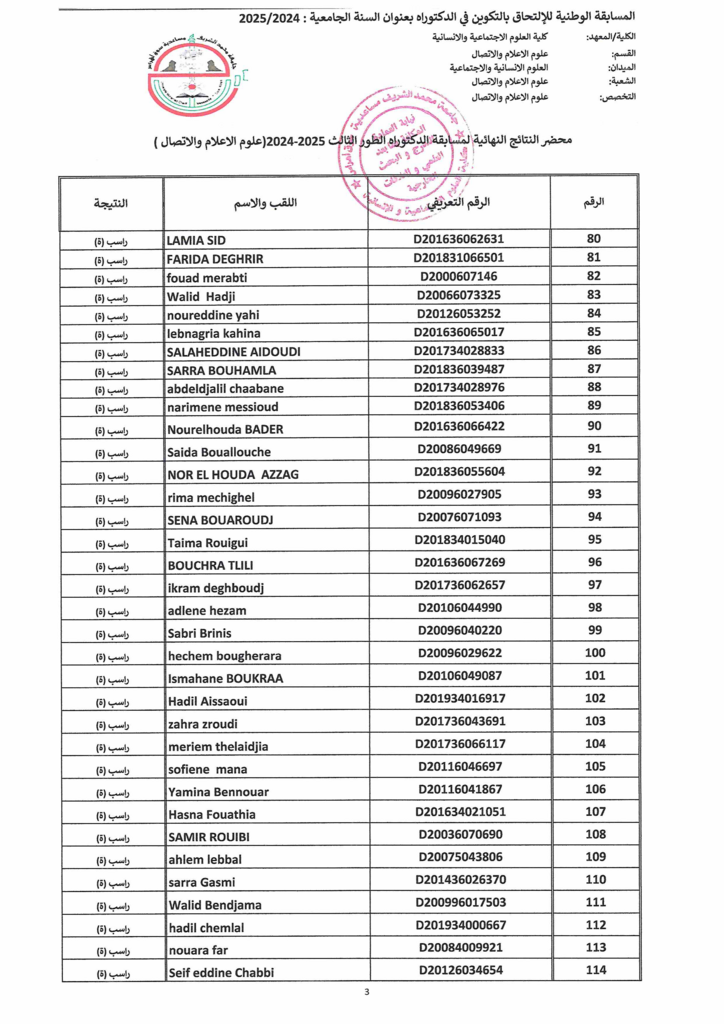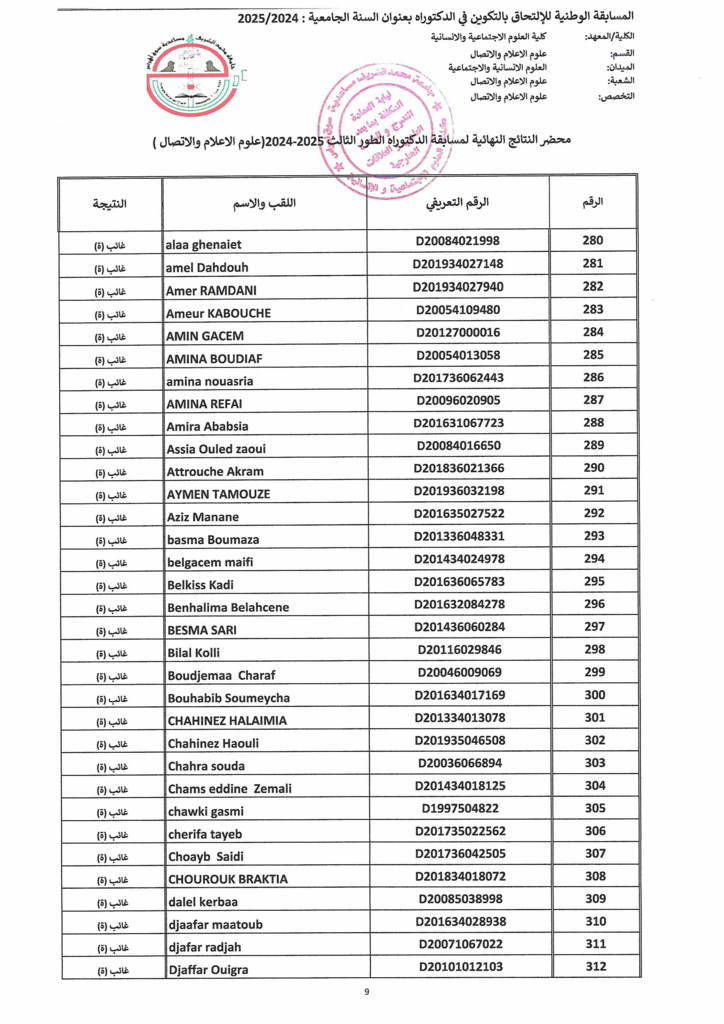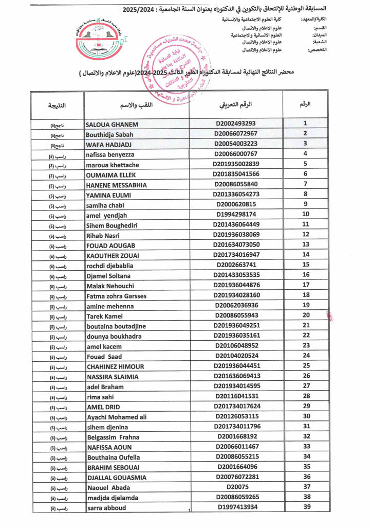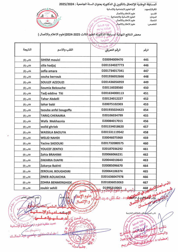 نتائج مسابقة الدكتوراه الطور الثالث للسنة الجامعية 2025/2024 شعبة علوم الإعلام والإتصال، تخصص علوم الإعلام والإتصال