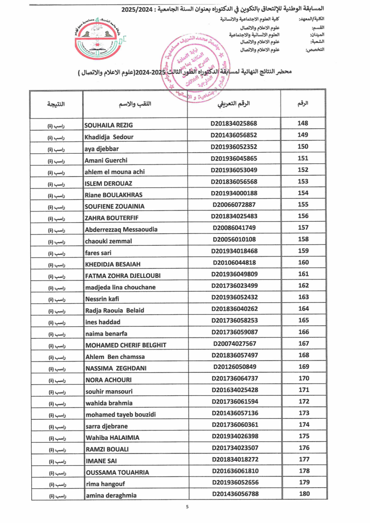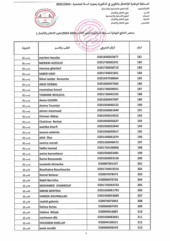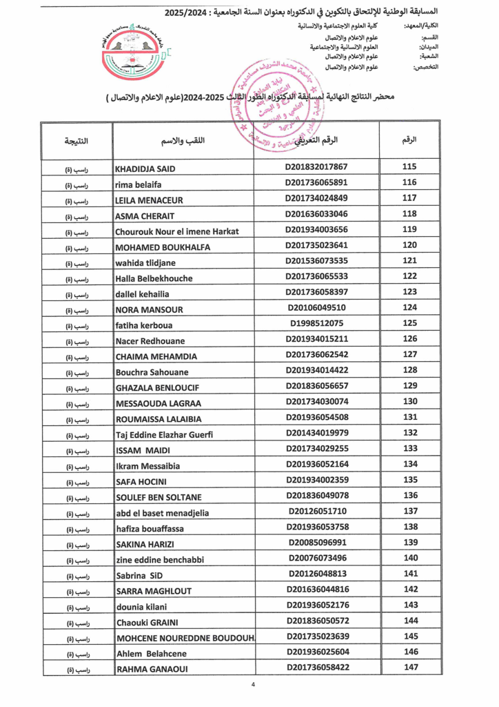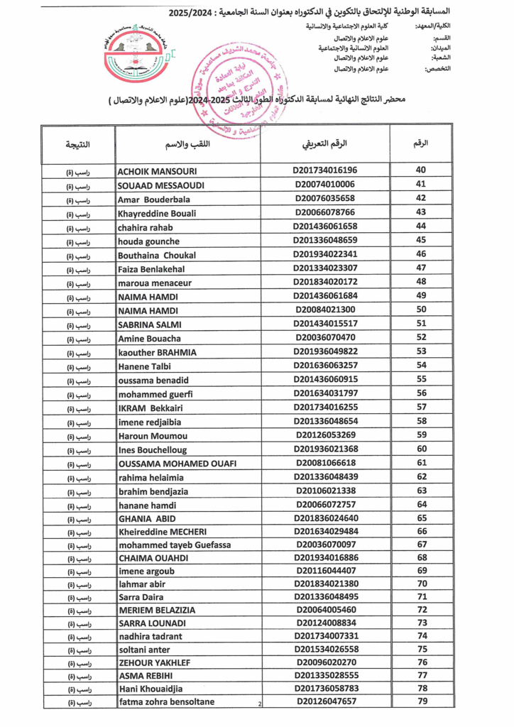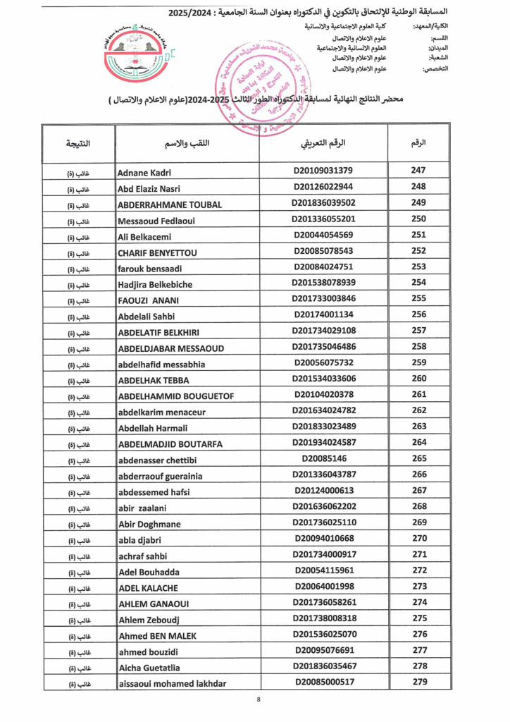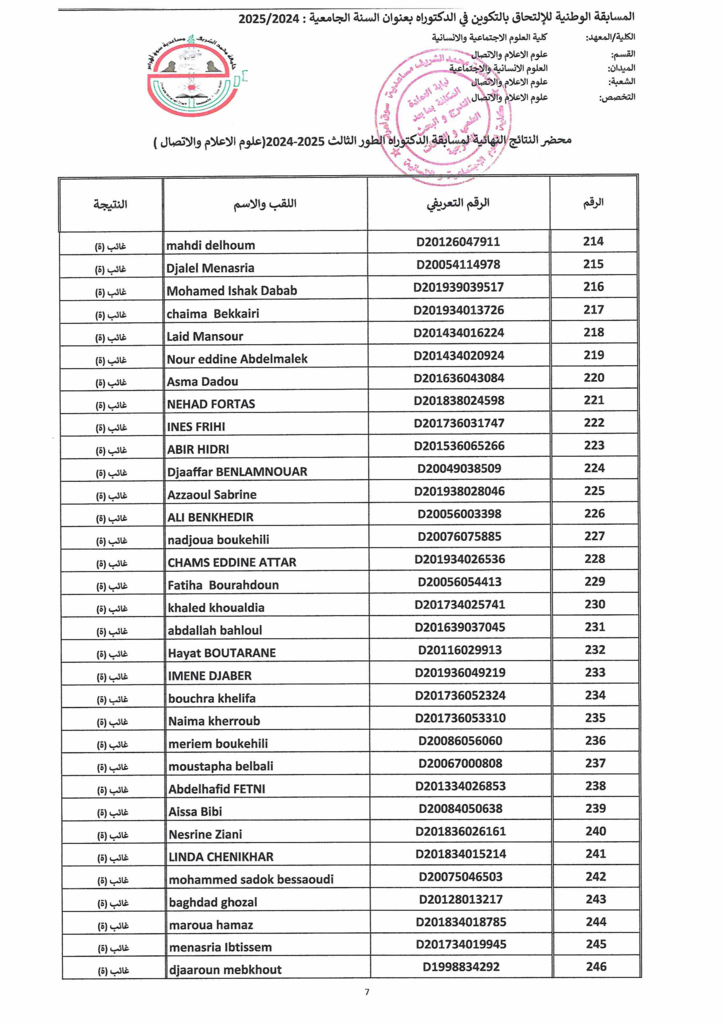 نتائج مسابقة الدكتوراه الطور الثالث للسنة الجامعية 2025/2024 شعبة علوم الإعلام والإتصال، تخصص علوم الإعلام والإتصال