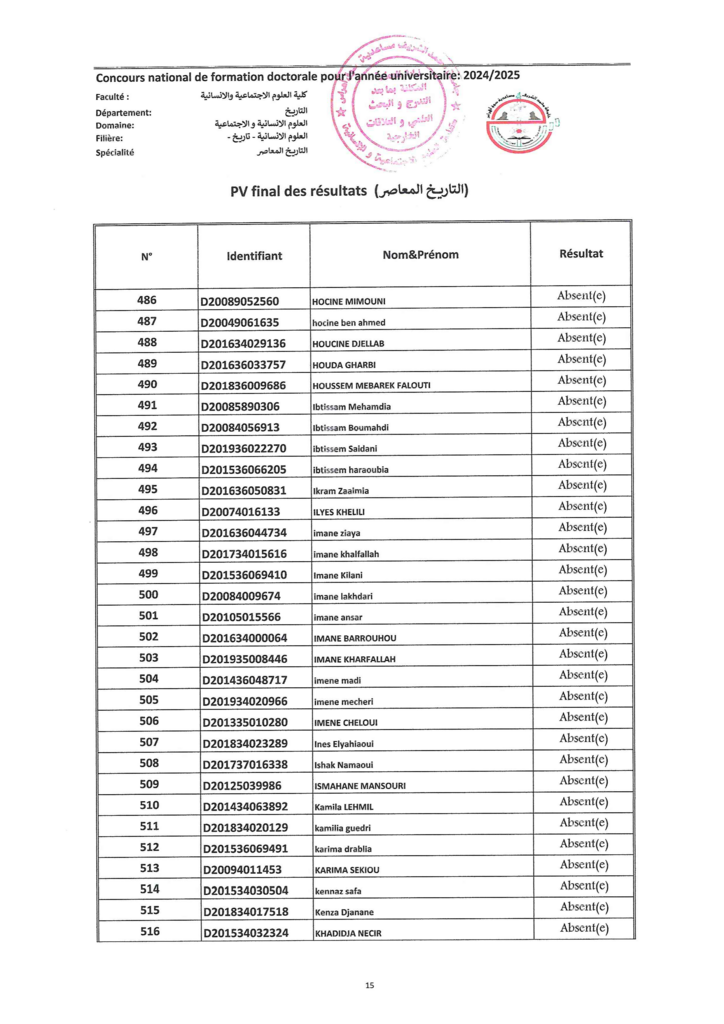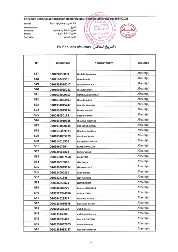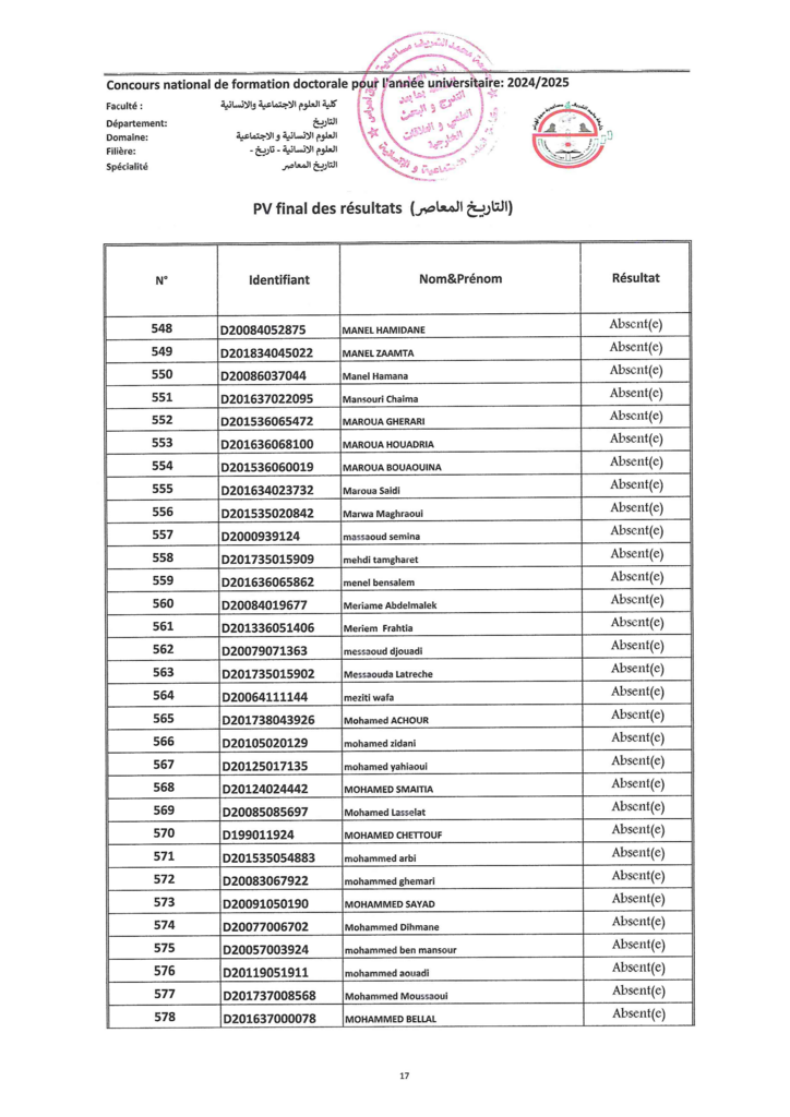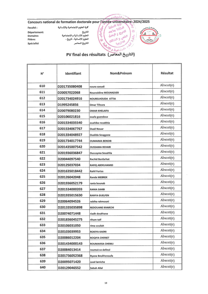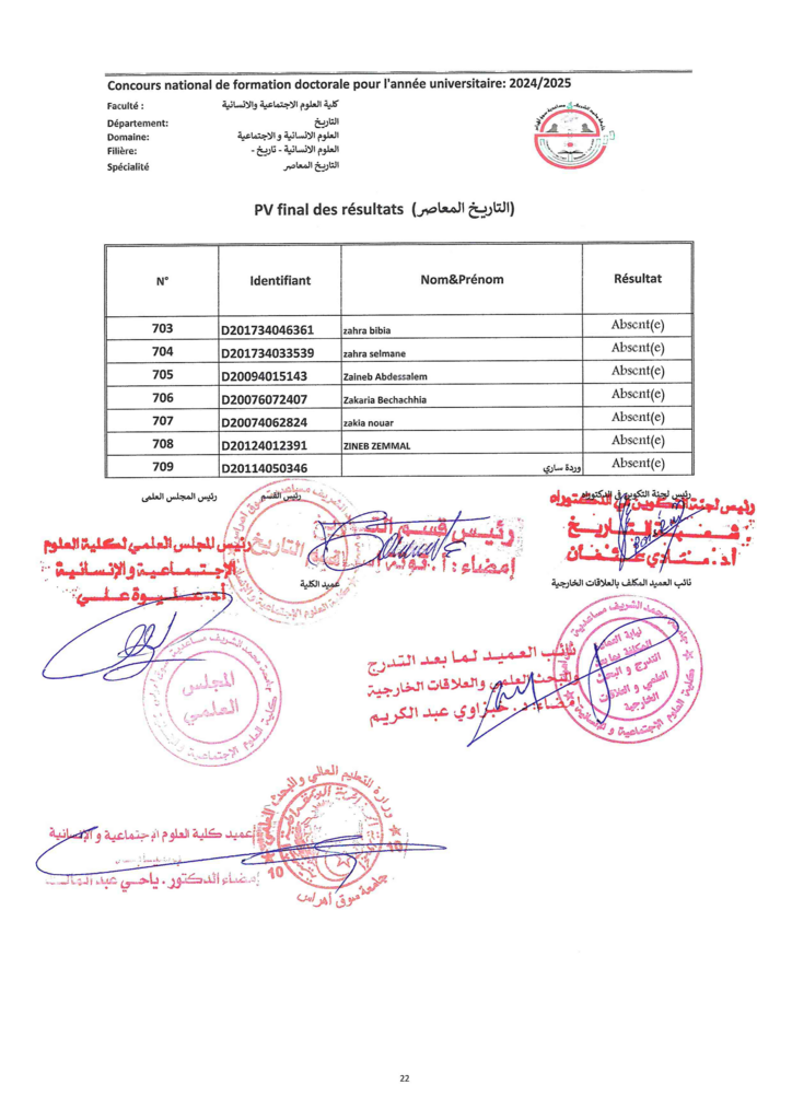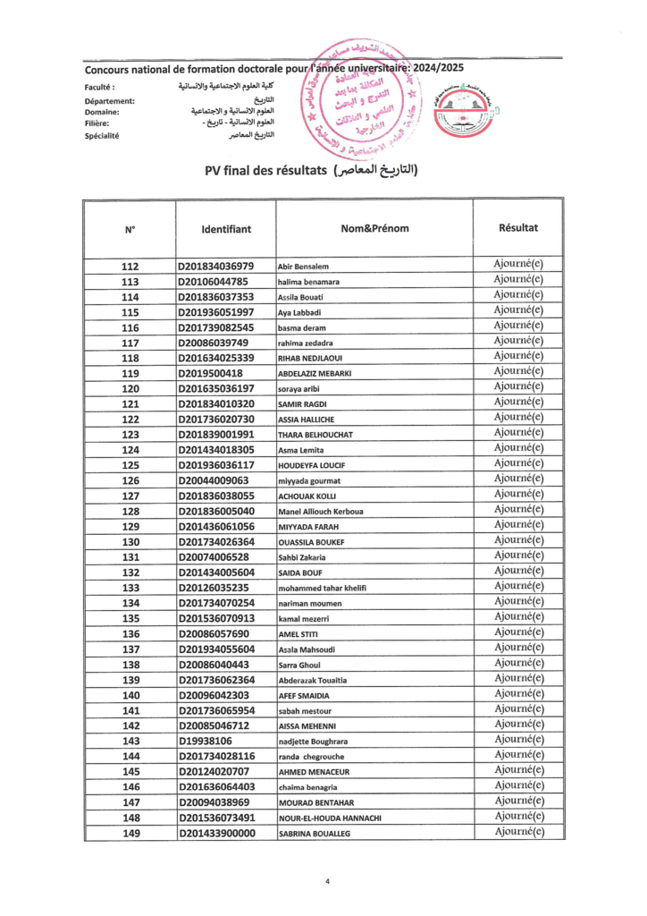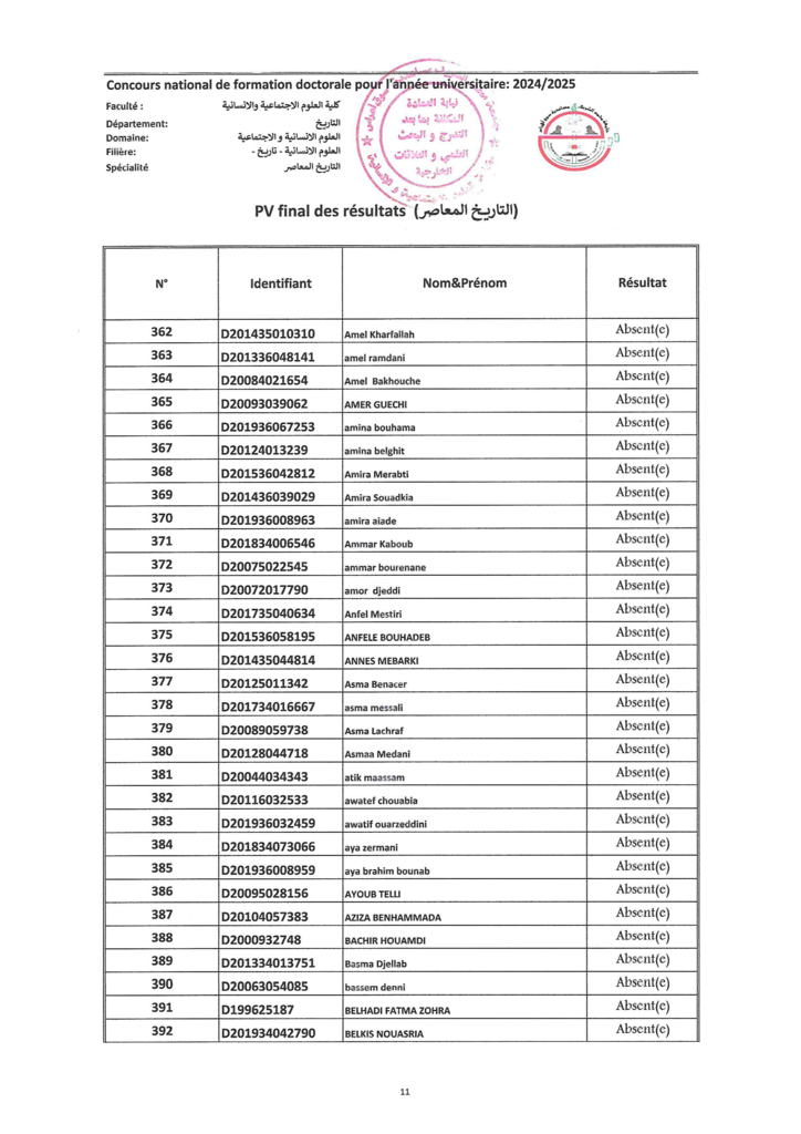 نتائج مسابقة الدكتوراه الطور الثالث للسنة الجامعية 2025/2024 شعبة التاريخ، تخصص تاريخ معاصر
