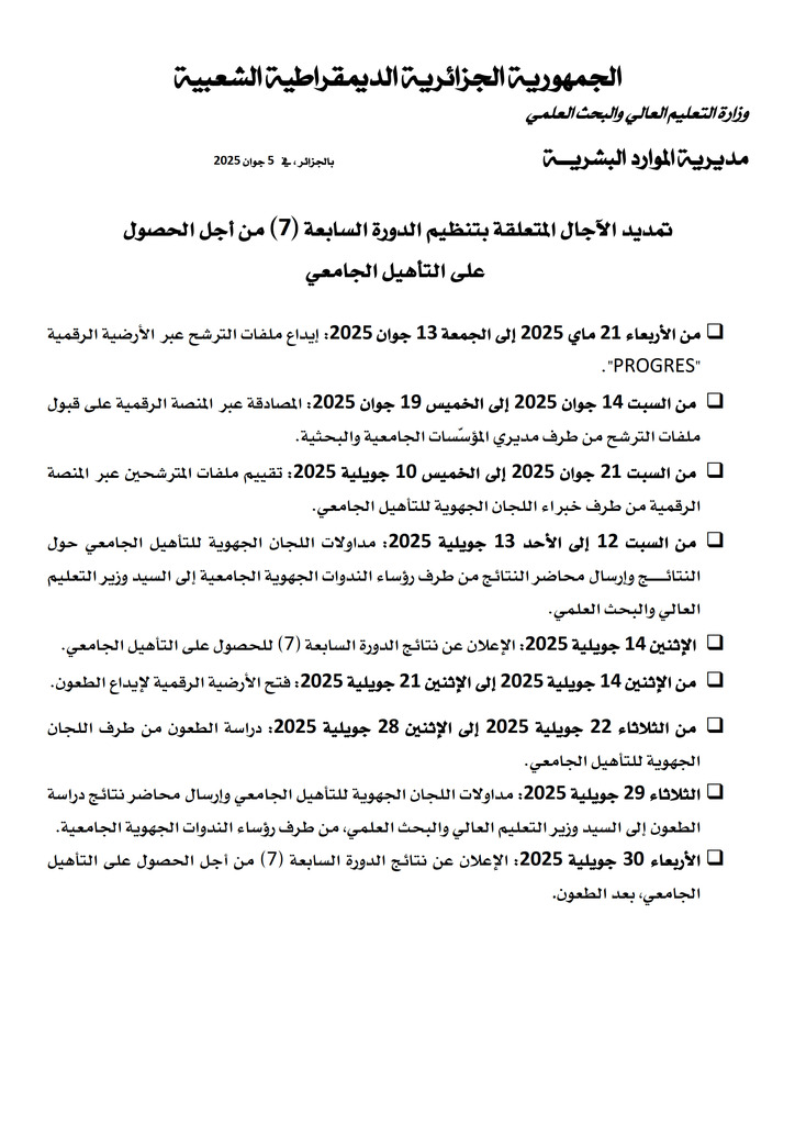 تعلم مديرية الموارد البشرية لوزارة التعليم العالي والبحث العلمي كافة الأساتذة المحاضرين قسم “ب” والأساتذة الباحثين قسم “ب” عن إفتتاح الدورة السابعة (7) للحصول على التّأهيل الجامعي.