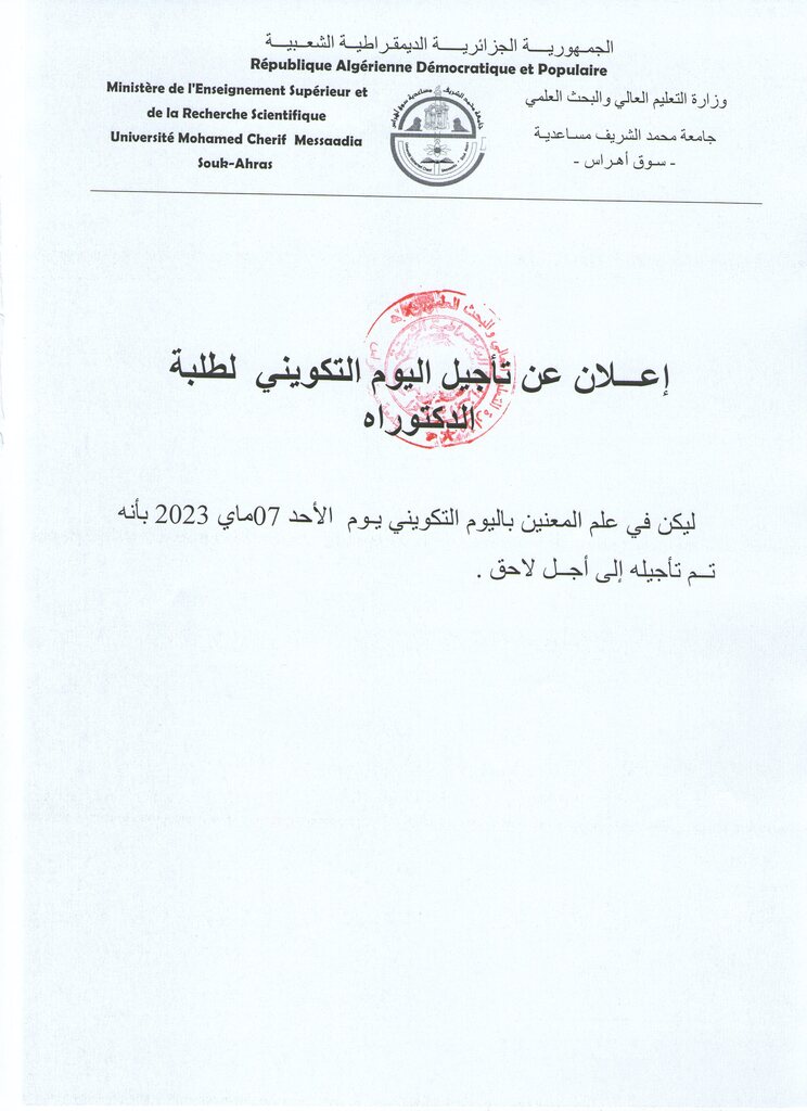 إعلان هام: تاجيل اليوم التكويني لفائدة طلبة الدكتوراه