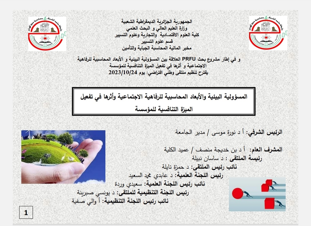 الملتقى الوطني الافتراضي :المسؤولية البيئية والابعاد المحاسبية للرفاهية الاجتماعية وأثرها في تفعيل الميزة التنافسية المؤسسة