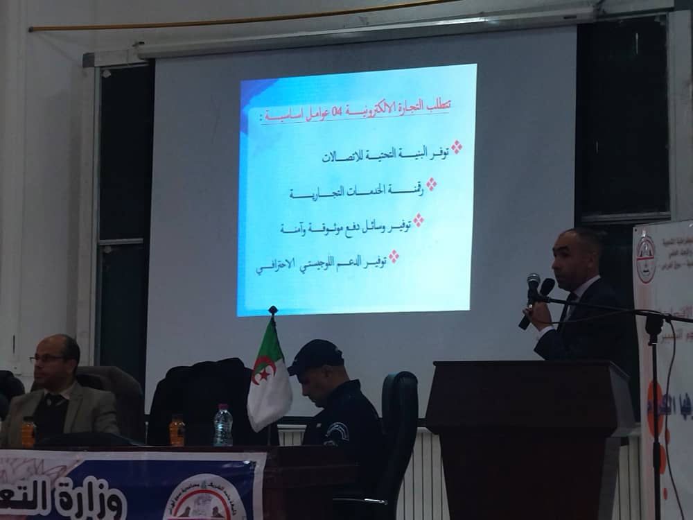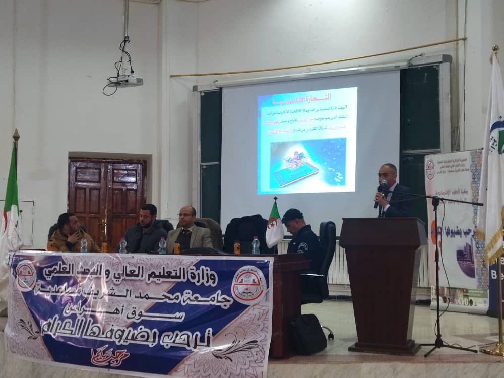 تم خلال هذا اليوم الدراسي عرض مداخلات حول التجارة الالكترونية ومختلف آليات الدفع الالكتروني وكذا الخدمات والمعاملات الالكترونية، وشرح وافي للجرائم الالكترونية والامن السيبرياني، مع عرض تجربة حية عن شركة ناشئة في مجال التجارة الإلكترونيّة. حيث تم تأطير هذه المداخلات من طرف أساتذة جامعيين، مدراء تنفيذيين للبريد والمواصلات، ممثلي الامن والدرك الوطني، المركز الوطني للسجل التجاري، ممثلي البنوك التجارية، الصندوق الوطني للضمان الاجتماعي، الجزائرية للمياه، سونلغاز، متعاملو الهاتف النقال، مديرية التجارة، صاحب شركة ناشئة.