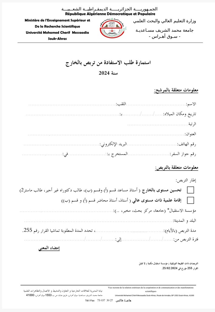 – تجدون مرفقا استمارة طلب التربص بالاضافة الى رابط الترشح الالكتروني للراغبين في الاستفادة من تربص بالخارج لسنة 2024