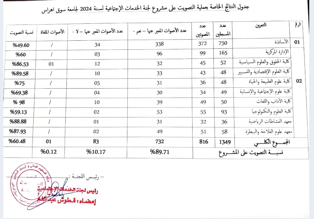 تضع لجنة الخدمات الإجتماعية لجامعة سوق أهراس نتائج محضر الفرز النهائي لنتيجة التصويت على مشروع برنامج الخدمات الإجتماعية لسنة 2024