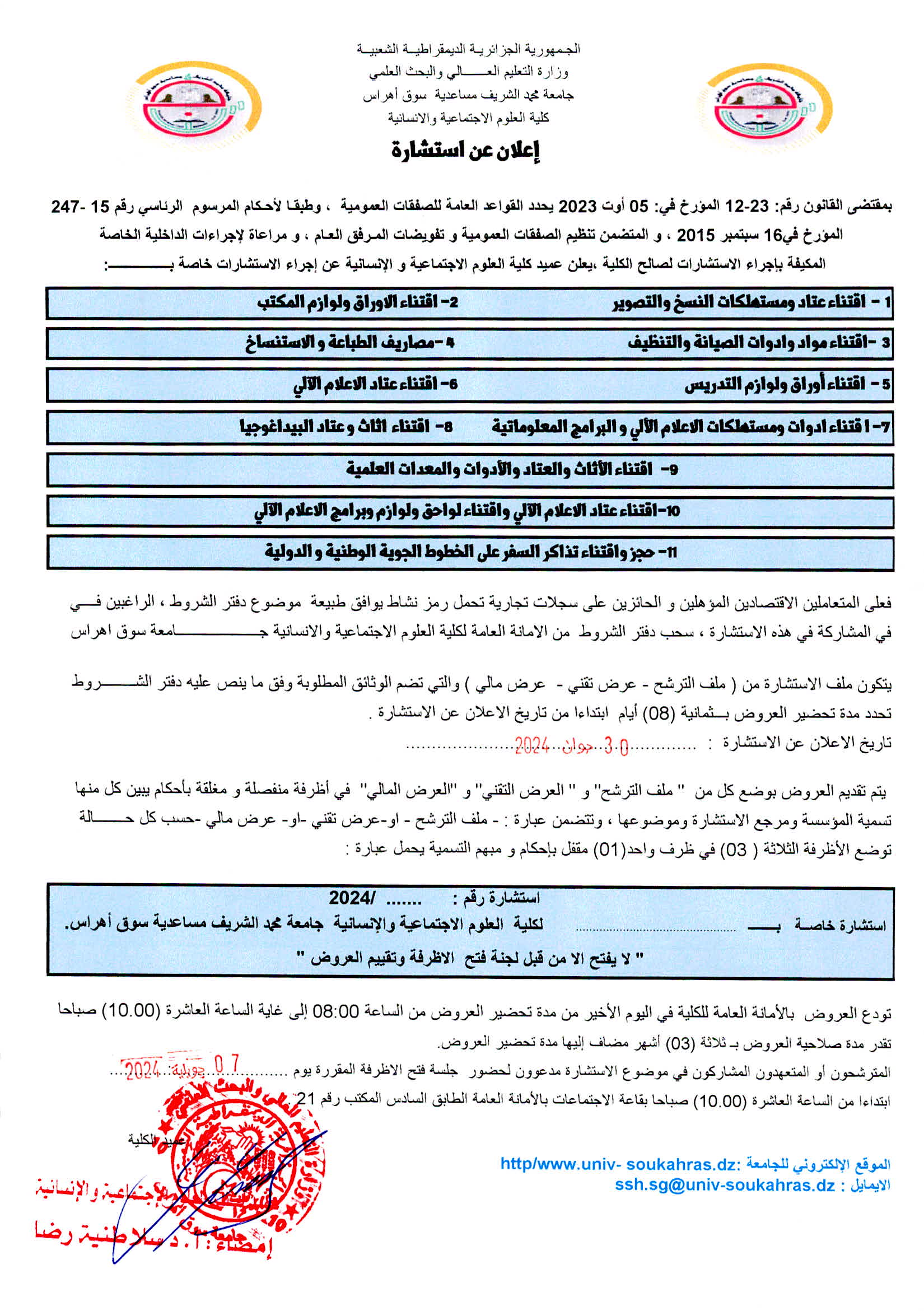 يعلن عميد كلية العلوم الاجتماعية و الانسانية عن إجراء مجموعة من الاستشارات للإطلاع على المزيد من المعلومات يرجى الضغط على تحميل