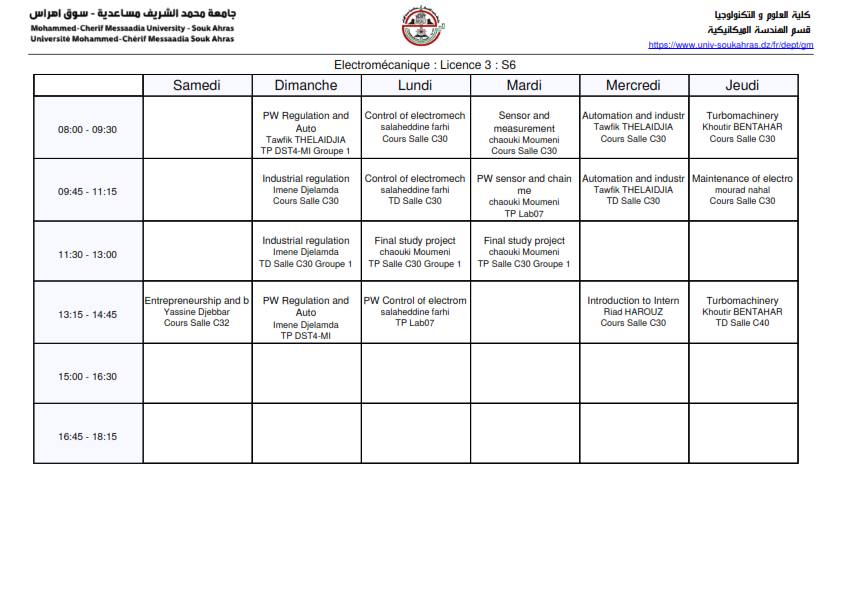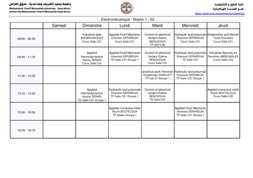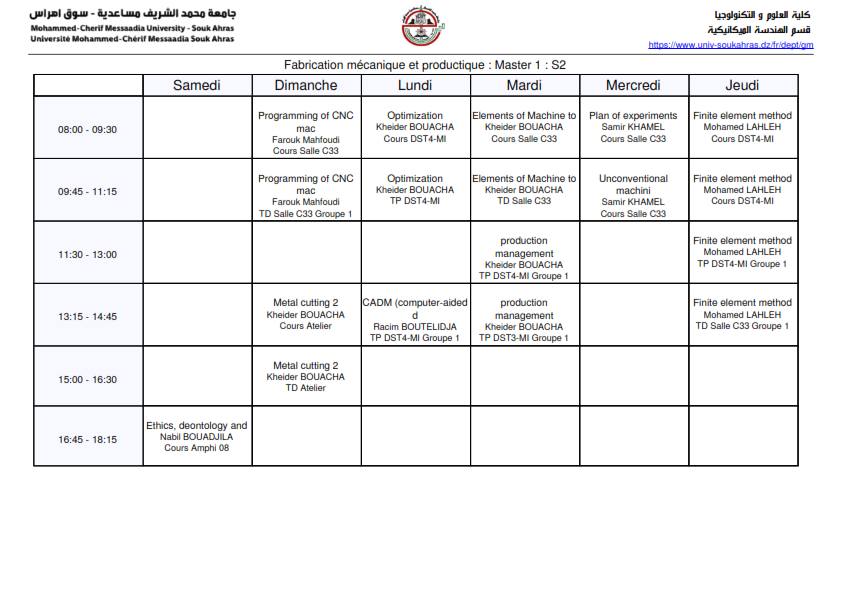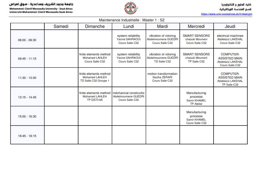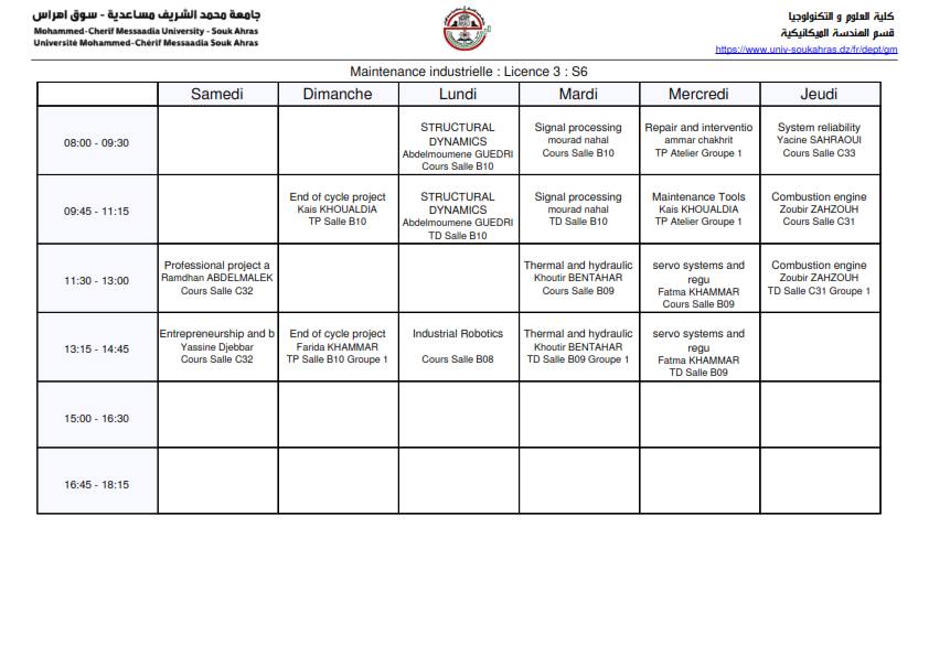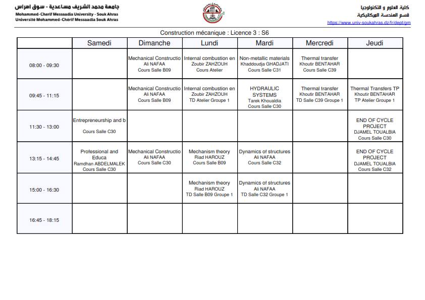 التوزيع الزمني للسداسي الزوجي لقسم الهندسة الميكانيكية